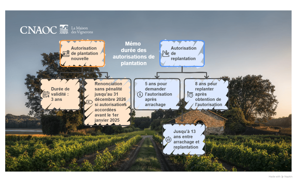 Pour les plantations nouvelles, le principe reste inchangé : une durée de validité de 3 ans, désormais harmonisée jusqu’à la fin de la campagne viticole. Une mesure transitoire permet toutefois de renoncer sans pénalité jusqu’au 31 décembre 2026 aux autorisations délivrées avant le 1er janvier 2025. En cas d’aléas climatiques ou sanitaires, une prolongation jusqu’à 12 mois est désormais possible, avec la même faculté de renonciation.